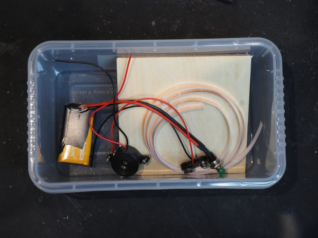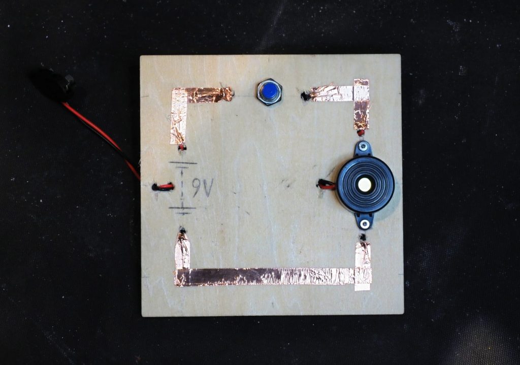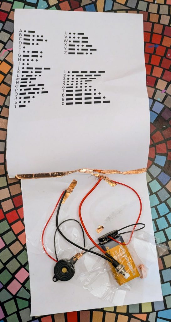 The simplest oscillator for a Scout to make is a piezo buzzer with a battery and push-button. These parts are readily available in large quantities for little cost online. The circuit was made using copper tape, so avoiding the need to teach and supervise soldering. Some scouts built onto wooden squares. Others built onto the paper with the Morse Code lookup table printed on it.